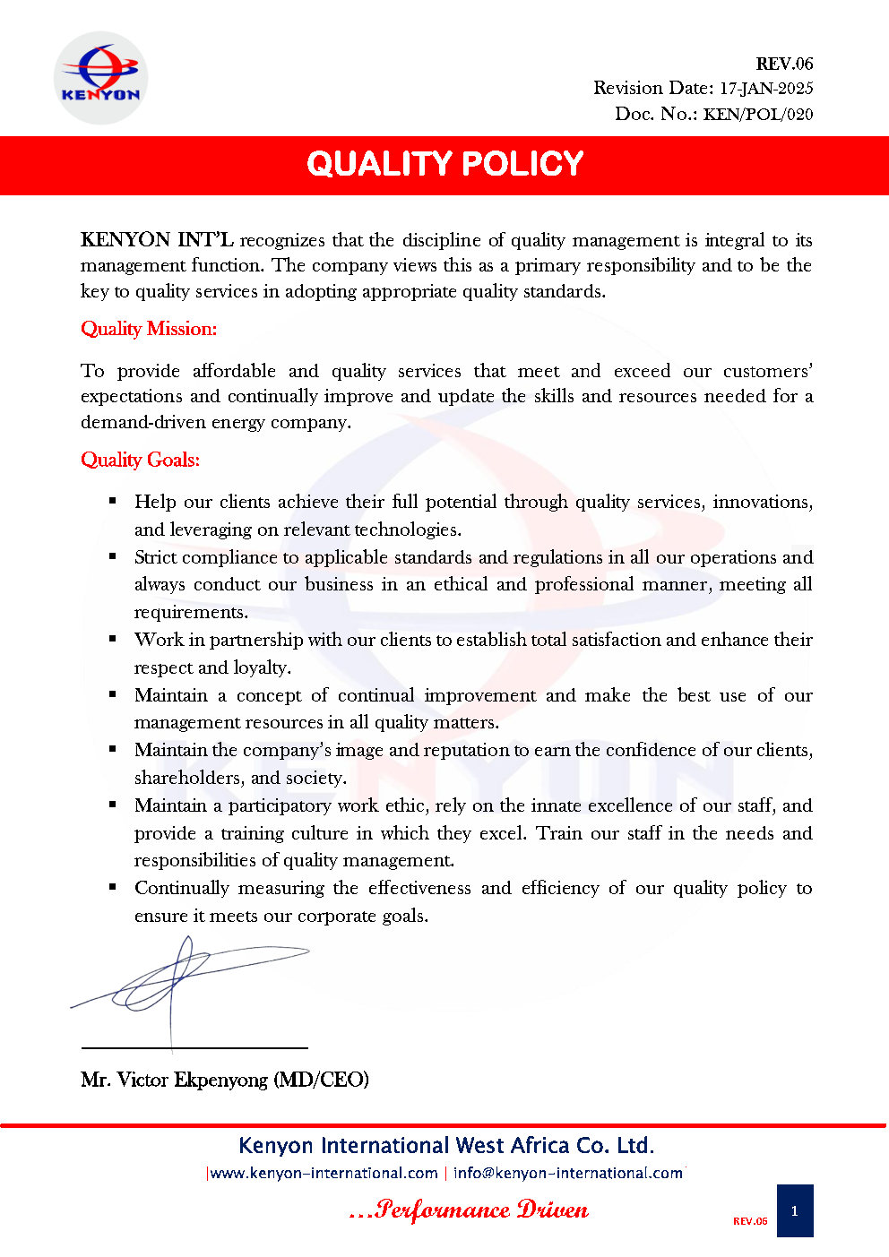KENYON QUALITY POLICY